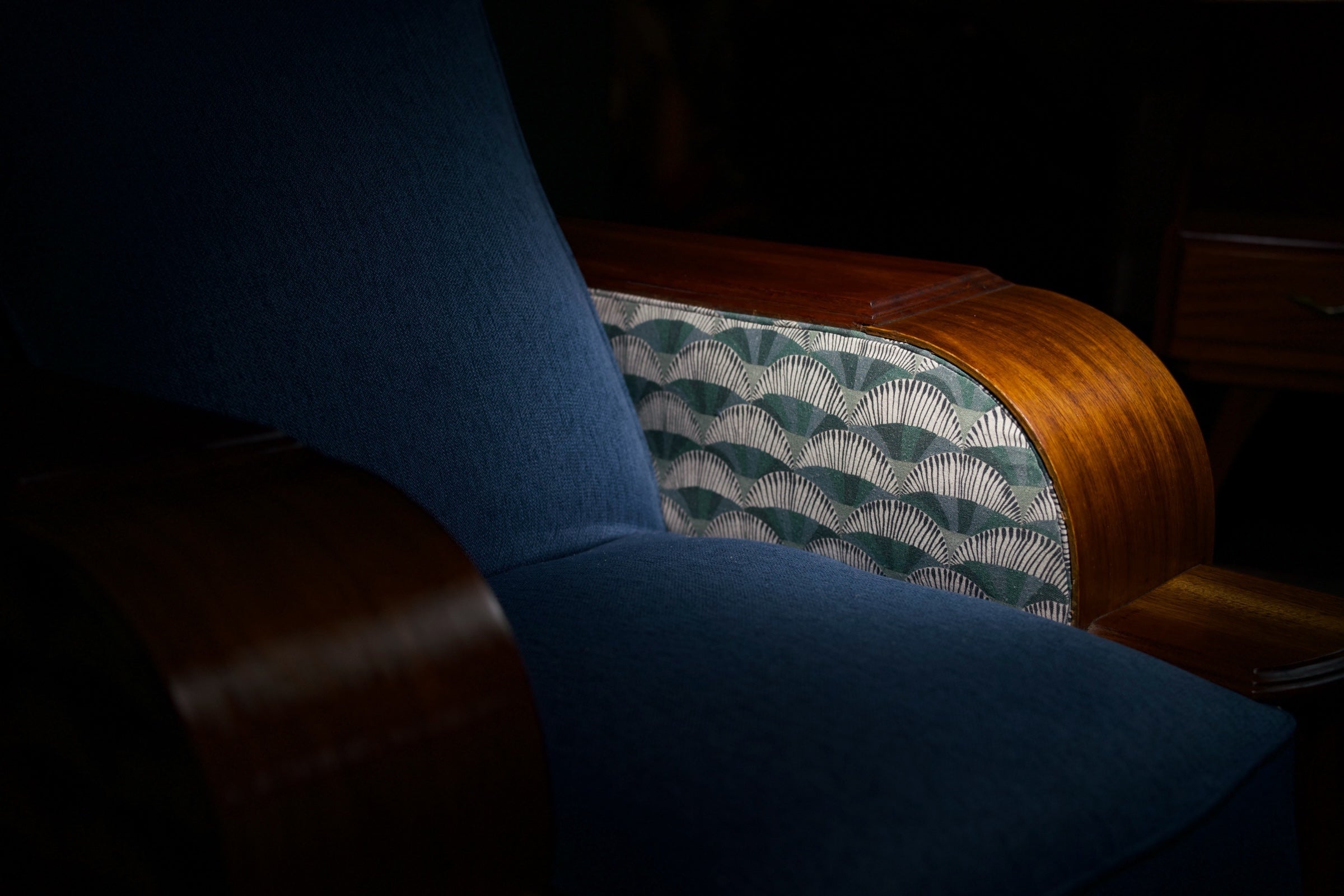 We carefully refurbished the wood, restoring the warmth and richness of its original structure. Then, guided by Sunset Soda’s unique artistic flair, we selected a combination of textured blue upholstery and patterned side panels that bring softness, personality, and modern energy to the chair’s strong architectural form.